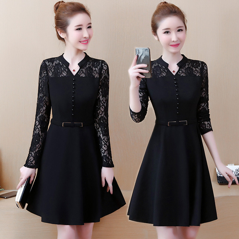 2019新款春秋装大码蕾丝镂空长袖连衣裙收腰显瘦名媛修身裙子女 | |